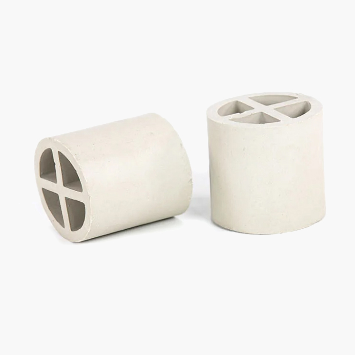 陶瓷十字隔板環(huán)填料是基于增加填料的比表面積,從而強(qiáng)化傳質(zhì)效率而開發(fā)出來的。 其形狀是在拉西環(huán)中間增設(shè)了十字隔板。 一般來講,這種填料由于尺寸較大,僅適用于整體堆徹,目前一般只作為亂堆填料的塔底支撐分布層用。