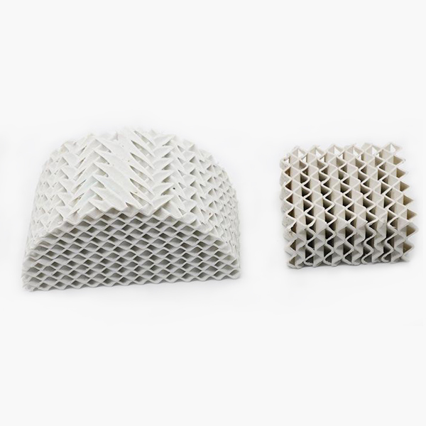 陶瓷波紋填料是一種新型規(guī)整填料,它是由許多具有相同幾何形狀的填料單元體組成。由于陶瓷獨(dú)特的結(jié)構(gòu),具有良好的親水性能,其表面可形成極薄的液膜的湍動(dòng)及氣流的傾斜曲折通道能促進(jìn)氣流但又不阻擋氣流使陶瓷填料能與金屬填料相匹敵,而其耐腐蝕、耐高溫性能金屬填料卻無法相比。表面結(jié)構(gòu)有良好的濕潤性能,能使液體加快流動(dòng)、使填料滯液量降至最低。從而降低了過熱、聚合和結(jié)焦的機(jī)會(huì)。